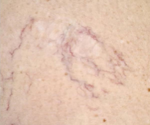 La paciente se sometió a un tratamiento esclerosante para eliminar las arañas vasculares. Tras inyectar una solución directamente en la vena afectada la misma cicatriza, es absorbida por el tejido local y con el tiempo desaparece.